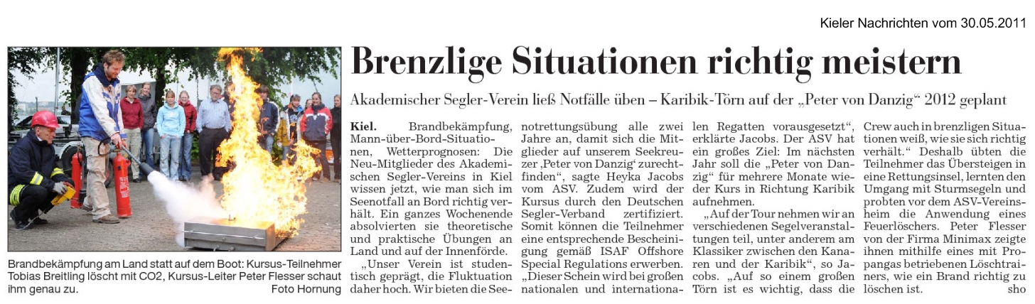 Bereits Ende Mai 2011 haben wir ein Hochseeüberlebenstraining gemäß den ISAF Offshore Special Regulations durchgeführt und waren damit auch in der regionalen Presse präsent. Ein besonderer Dank geht an dieser Stelle noch einmal an die Firma Minimax, die es den Kursteilnehmern ermöglichte, den richtigen Umgang mit verschiedenen Feuerlöschgeräten zu trainieren. Außerdem ein großes Dankeschön an die Deutsche Gesellschaft zur Rettung Schiffbrüchiger (DGzRS), die mit dem in Laboe stationierten Rettungskreuzer Berlin zur Stelle war um in der Heikendorfer Bucht möglichst realitätsnahe Unglücksfälle an Bord des Peter von Danzig zu simulieren.